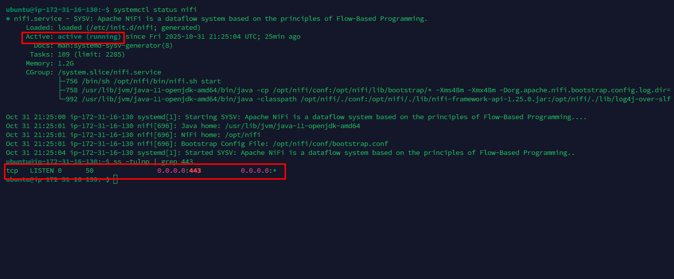 systemctl status nifi- Verification: The output should show the service status as active (running)