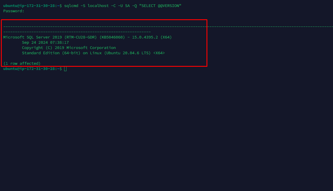 2. Verification: The output should return the SQL Server version information (e.g., Microsoft SQL Server 2019 ... on Linux (Ubuntu 20.04.6 LTS)).