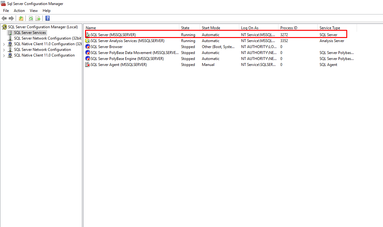 - In SQL Server Services, right-click on the SQL Server (MSSQLSERVER) service