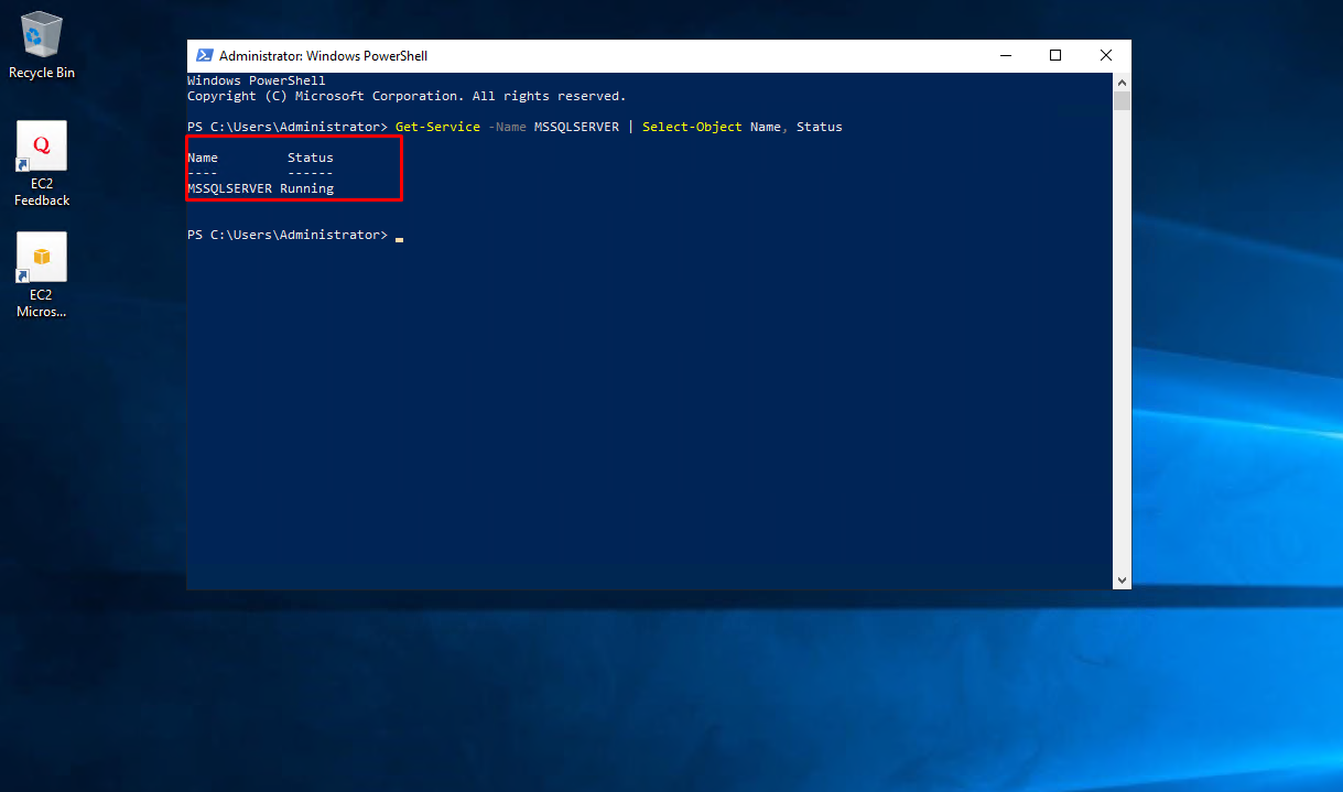 Use PowerShell to check if the main SQL Server service is running:Get-Service -Name MSSQLSERVER | Select-Object Name, StatusExpected output:
