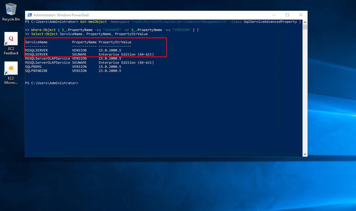 SKUNAME→ confirms Enterprise EditionVERSION→ confirms SQL Server 2019