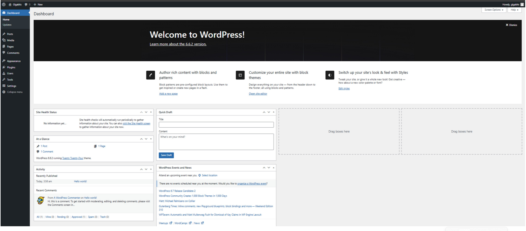 - WordPress Dashboard: After logging in, you will be directed to the WordPress dashboard where you can manage your site, create posts, install themes and plugins, and customize your website.