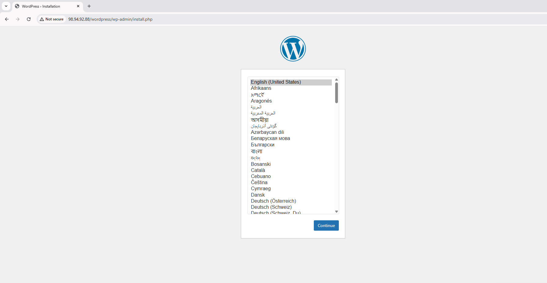 - Language Selection: The initial WordPress setup screen will appear. Select your preferred language (e.g., English (United States)) and click Continue.