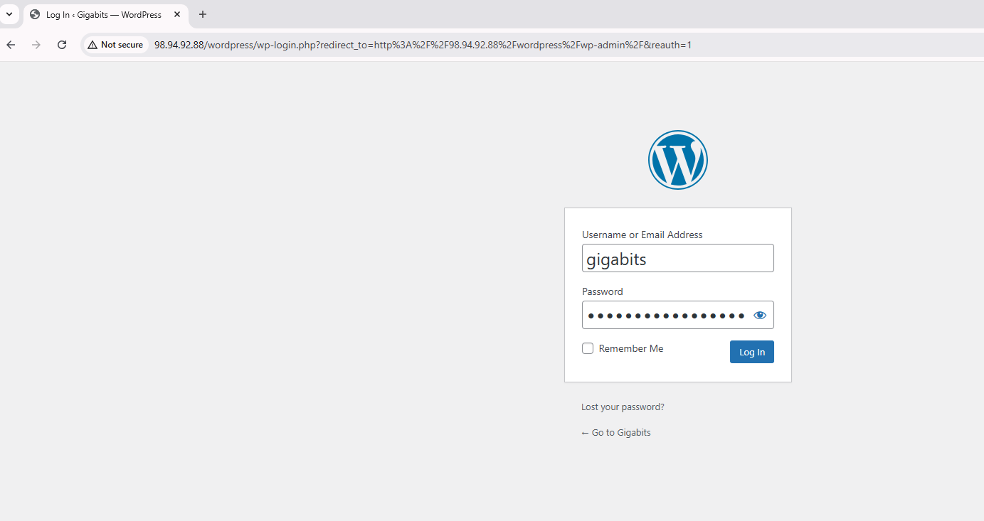 http://<server ip address>/wordpress/wp-adminto access the WordPress admin login page. Use the username and password you created in Step 3.