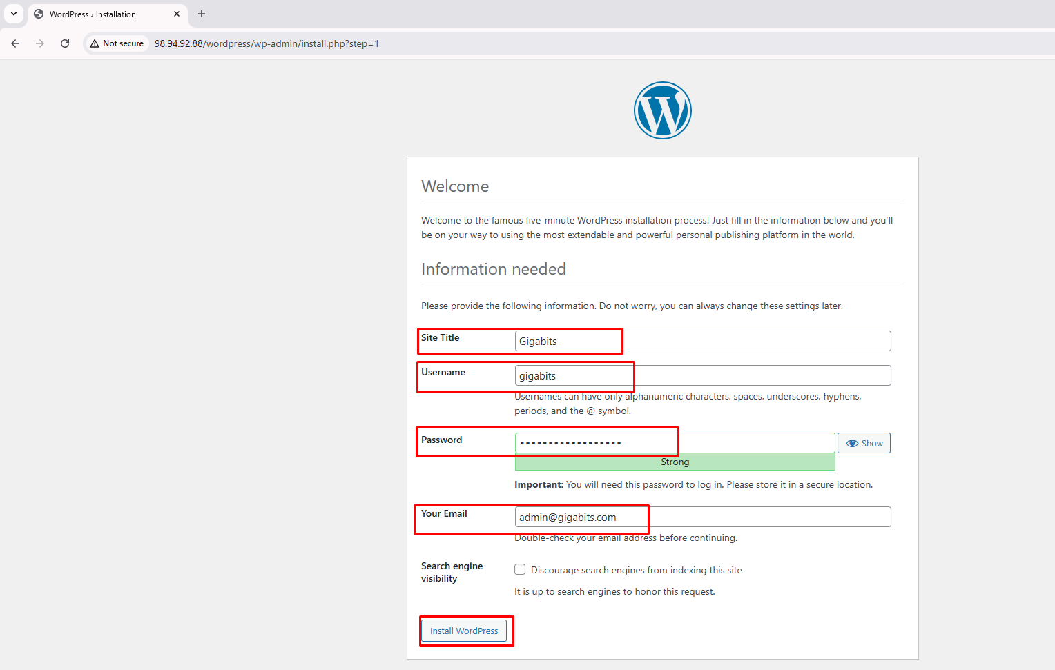 - Site Information: You will see the “Welcome to WordPress” page with fields to configure your site. Provide the required details: