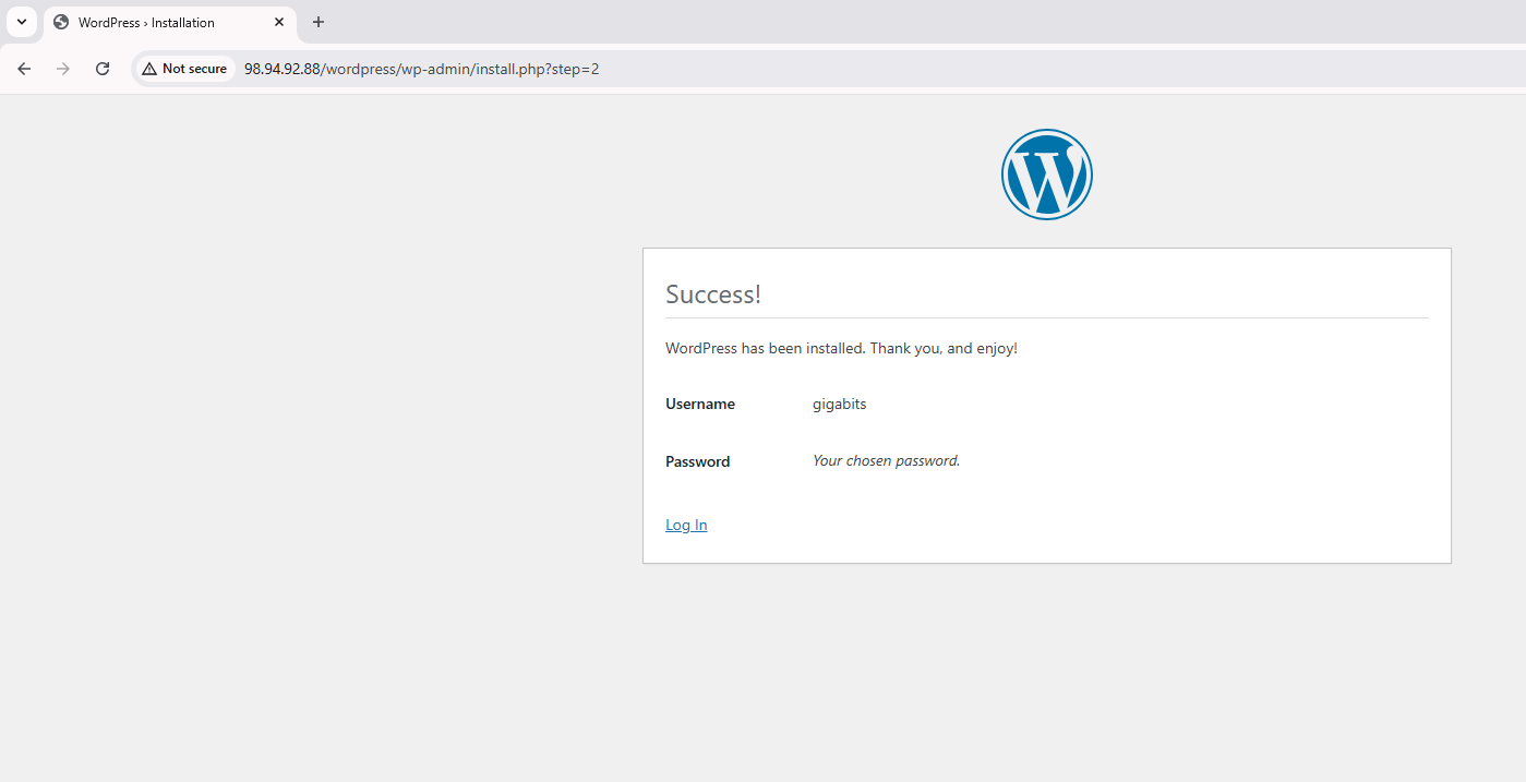 - Success Message: A success message will appear confirming WordPress has been installed successfully.